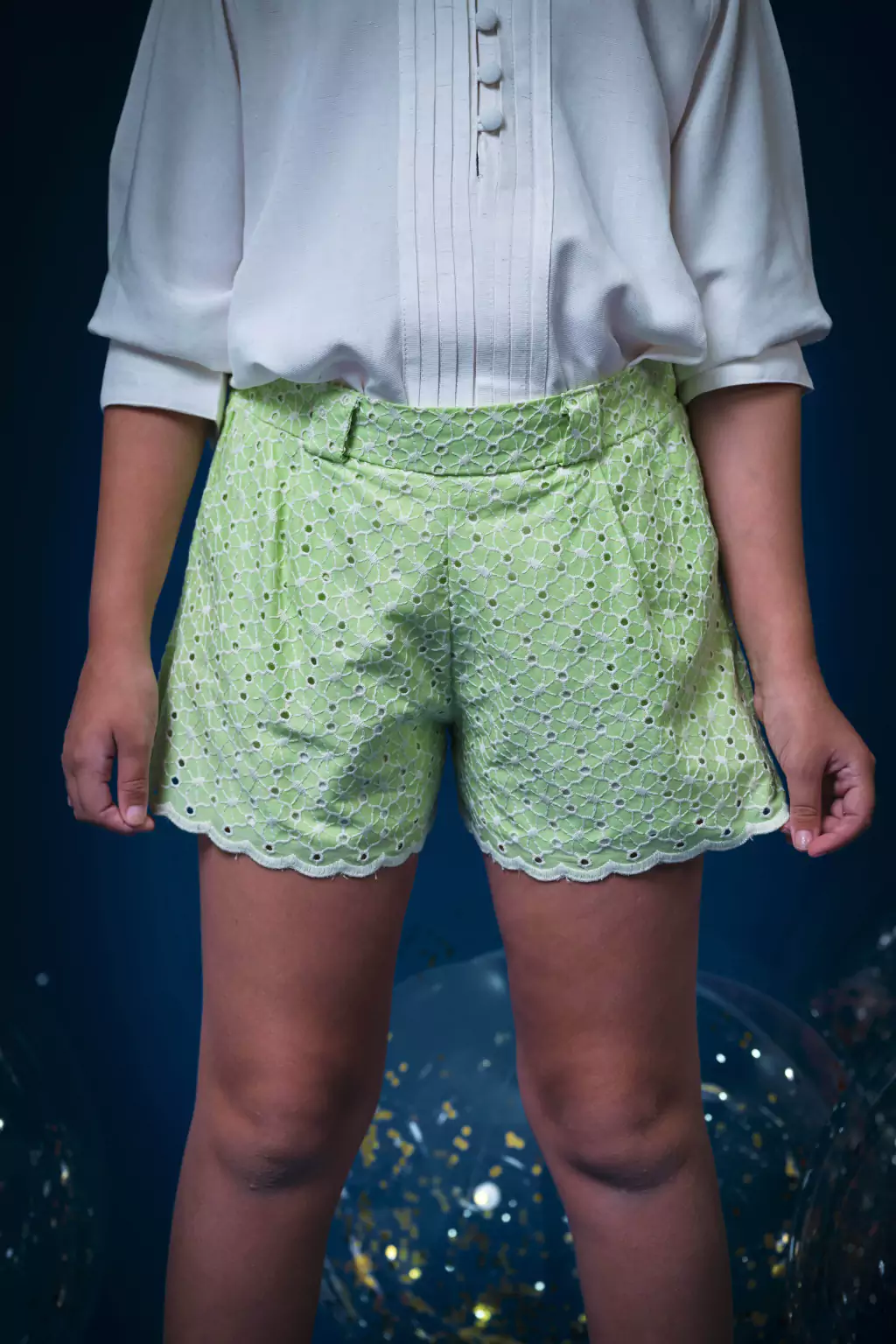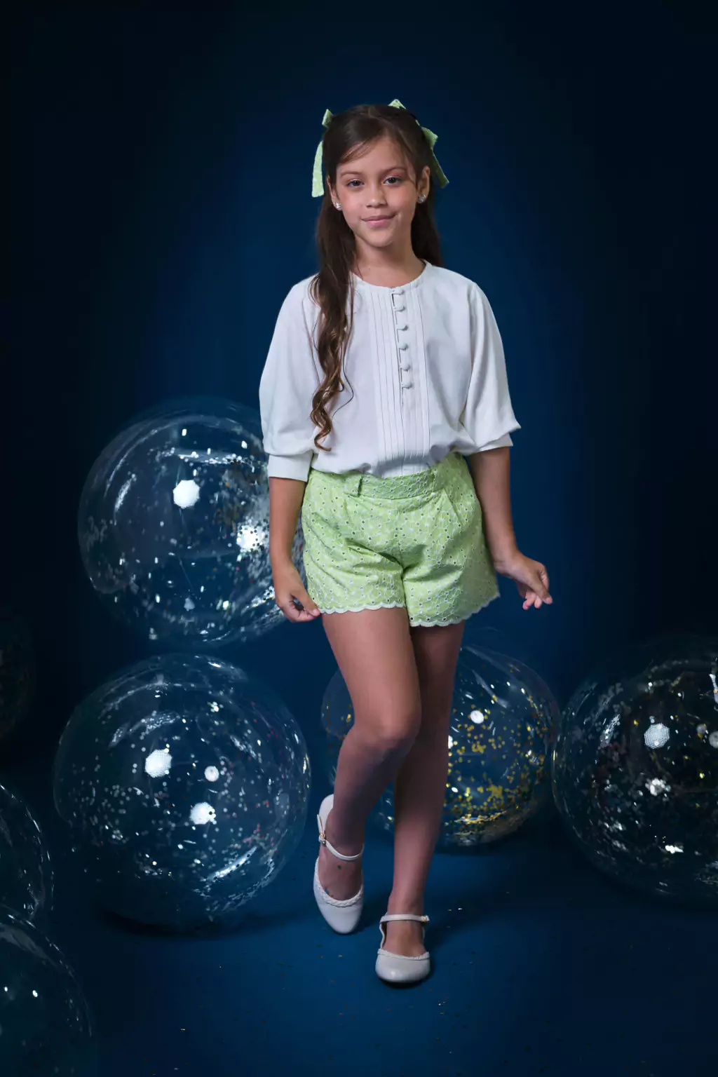 Conjunto Lúcia: camisa 97% viscose 3% linho, na cor off white. Possui botões forrados com o mesmo tecido na frente e um lindo detalhe de pregas. Mangas 3/4 com pala e fechamento em botões forrados. O short de laise, 100% algodão e forro 100% viscose, na cor verde. Barra com detalhes ondulados. Possui ajuste interno e possibilidade para colocar cinto. Uma ótima opção de conjunto sofisticado.