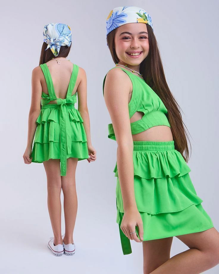 Conjunto Mamma: Um conjunto encantador! Feito em tecido 100% viscose de alta gramatura, na linda cor verde, traz um cropped moderno e delicado com costas em decote e faixa para ajuste, perfeito para brincar com estilo. A saia leve e rodada é cheia de camadas de babados, trazendo movimento e diversão a cada passo. Ideal para festas e passeios, este conjunto é a escolha perfeita para as pequenas fashionistas!