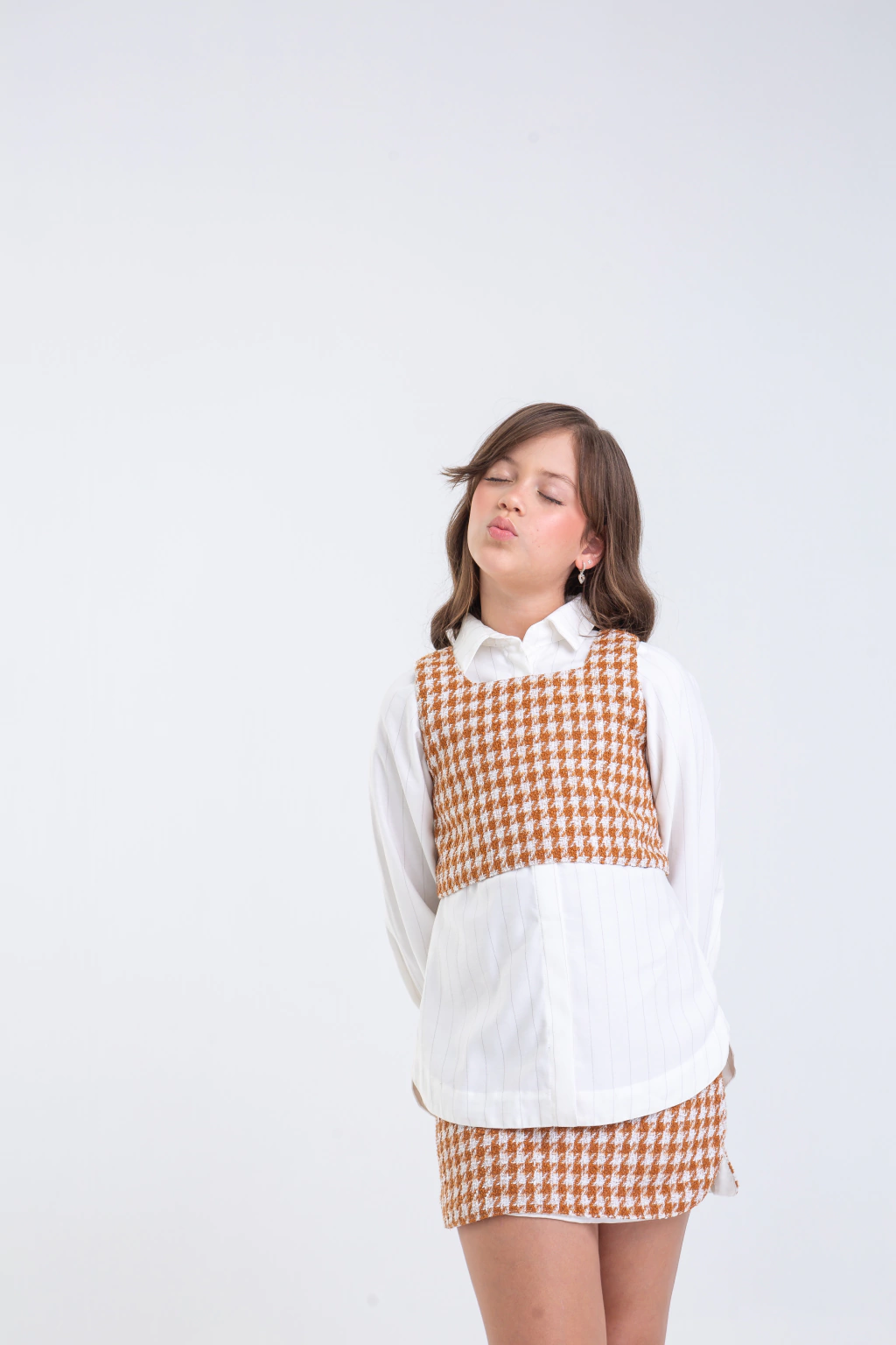 Cropped em Tecido Tweed Marrom e Off White, com leve brilho. Este cropped possui uma modelagem reta, confeccionado em um sofisticado tecido tweed, ele é confortável e estiloso.
