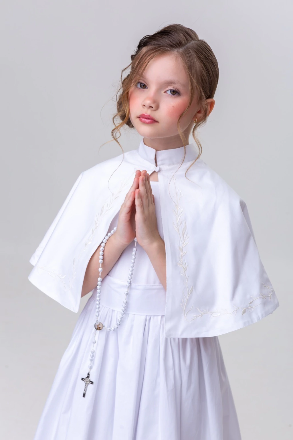 O modelo clássico acompanha o pelerine bordado delicadamente. Possui faixa para ajustar a cintura, além de possibilitar fazer um lindo laço nas costas. Saia com detalhe de camadas.